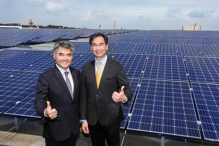 AUO's solar power plant at Lungke site is completed, with Michael Tsai, AUO’s President & Chief Operating Officer on the right, and TY Lin, AUO’s Senior Associate Vice President of Solar Business Group on the left.